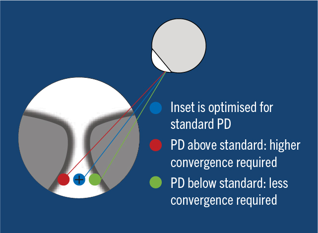 Thanks to the optimisation of the inset to the interpupillary distance of the customer, the main vision line of the lens is adapted to the natural convergence behaviour of the customer. This guarantees an optimum fusion of the monocular vision zones, right and left, as well as binocular vision in the standard position of wear.