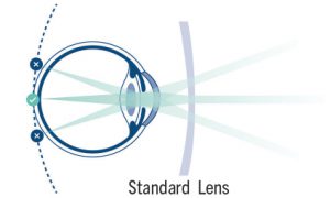 Standard single vision lenses are designed to correct central vision by bringing the image into sharp focus on the central retina. However, they do not address peripheral vision. Instead, they cause peripheral light rays to fall behind the retina.